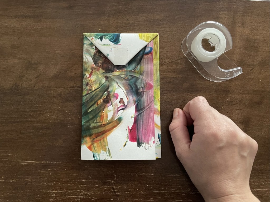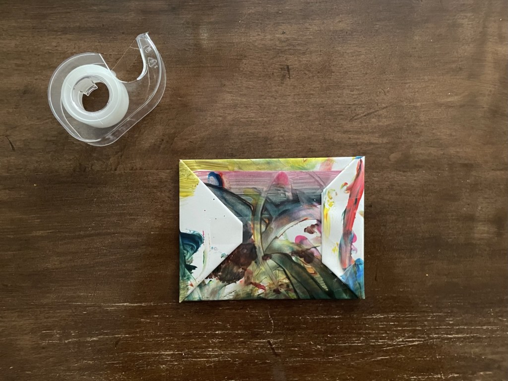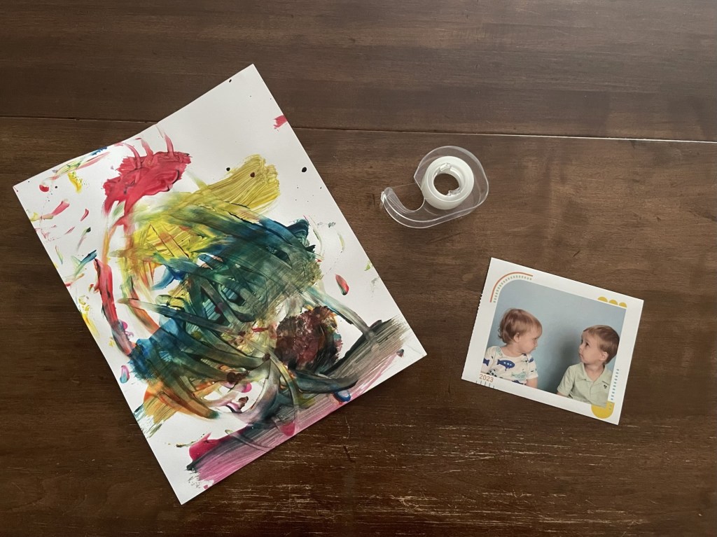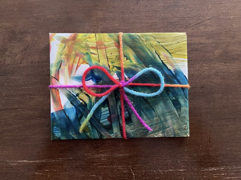 Below are some pictures for an example of how I have “helped” the children wrap gifts. I’ve included two different ways to fold painted paper (I find these the easiest). Keep in mind that these paintings are on 8.5 x 11 thick card stock, so this paper is more sturdy. Therefore, other paper options may tear more easily when wrapping gifts. This is the paper we used: https://a.co/d/7NRzrlj. The children used Crayola Spill Proof Washable Paint Set (https://a.co/d/b5TK5NA). The “gift tags” were pieces of Cricut Smart Removable Vinyl in Transparent (https://a.co/d/8ysHJPE) that were left over from previous projects (cut down to fit our needs). Don’t forget to use scraps to make life easier and add variety to the gifts like we did with the bow made of yarn!