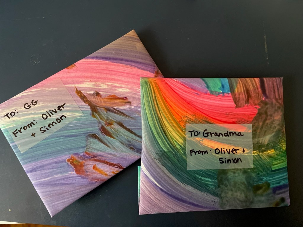 Gift wrap is expensive! It can also be hard to find good options for all the different occasions in life. As a mama who is always looking for ways to save a penny (and make life easier), this creative outlet for children saves you a few bucks-all while making their gift-giving experience more special (for the gift-giver and recipient). We have done this for all of the grandparents in our family and they love it! Both of our boys felt proud when they saw their grandparents’ reactions.