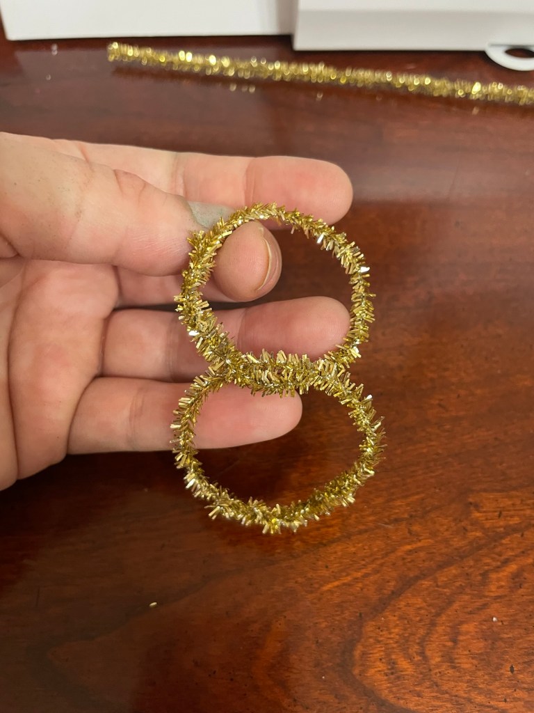 Take the next pipe cleaner and make it loop it around the first circle you made. Fasten the second circle into place.